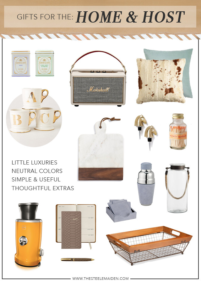 So my advice? Gift either a little luxury (think a leather bound planner or cowhide throw pillow) or something simple & useful (think their favorite tea or a pretty jar of matches). Undoubtedly a gracious host will be thankful for anything you bring, but why not be remembered for being the person that brought those golden monogrammed mugs?